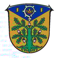 Unter blauem Winkelschlildhaupt, darin zwischen zwei goldenen Schindeln von einer wachsenden, abgewendeten silbernen Abtkrümme eingeschlossen eine mit 3 roten Kugeln belegte rot gefütterte Krone, in Gold eine grüne Eiche mit 5 silbernen Eicheln.